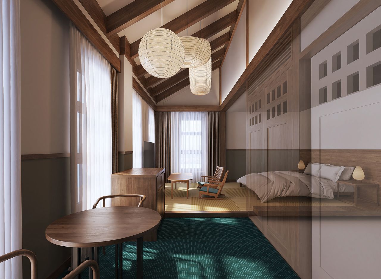 部屋に面したバルコニーからは東山を一望でき、三角屋根の高い天井を