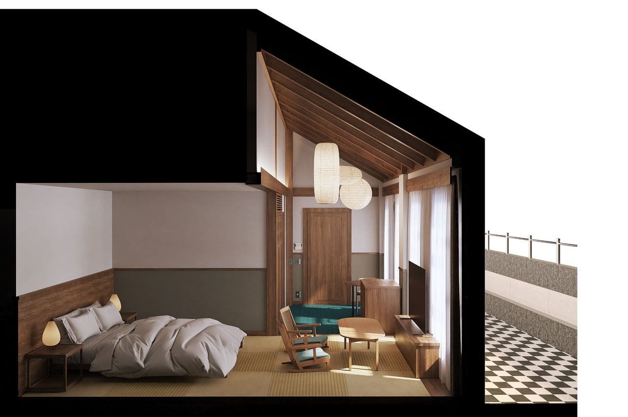 部屋に面したバルコニーからは東山を一望でき、三角屋根の高い天井を