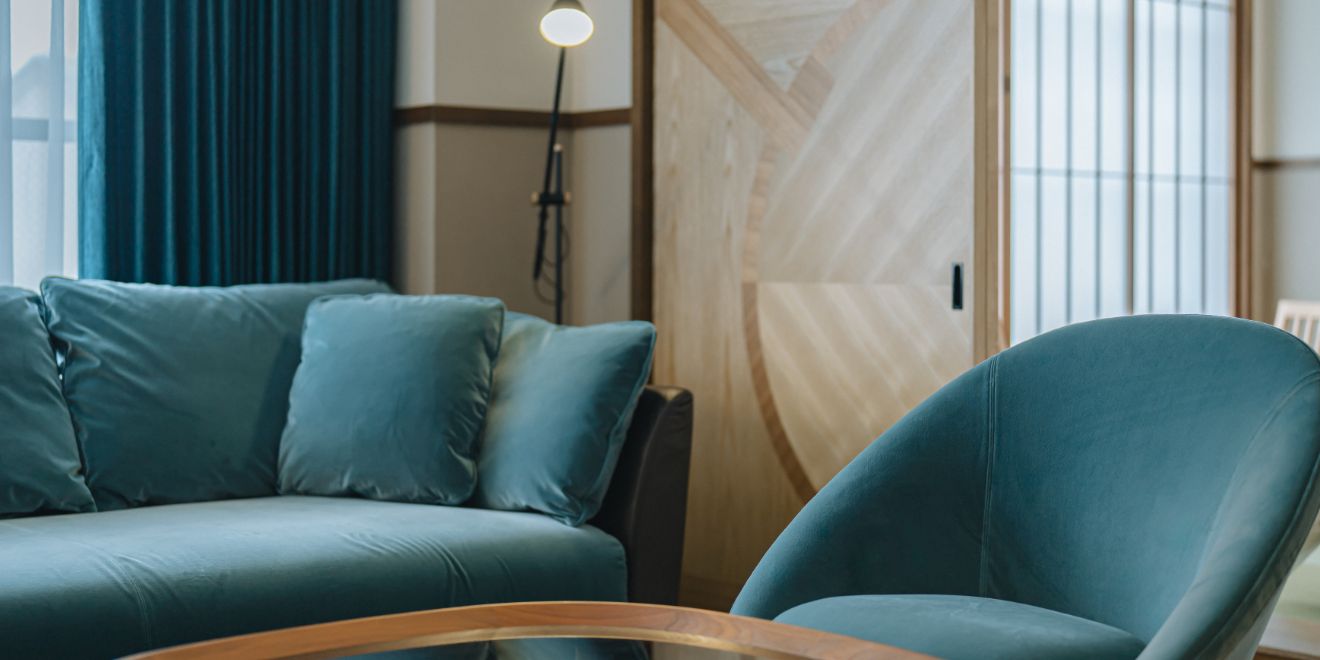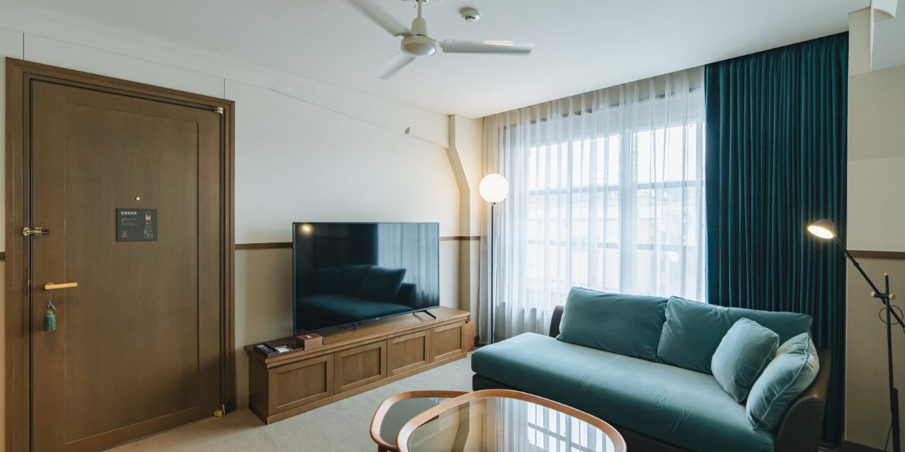 落ち着いた配色でまとめた既存棟の中でもモダンな印象の客室。リビングと